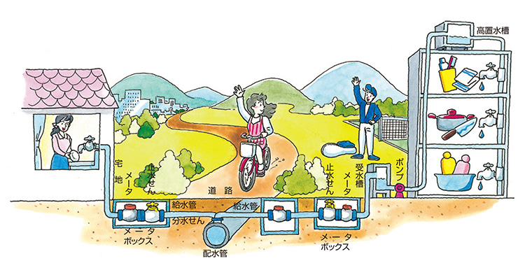 水道事業体が布設した水道管を配水管といいます。この配水管から分かれて、ご家庭まで引き込まれた給水管、分水せん、止水せん、メータ、給水せん(じゃ口)などの器具を総称して「給水装置」と呼んでいます。